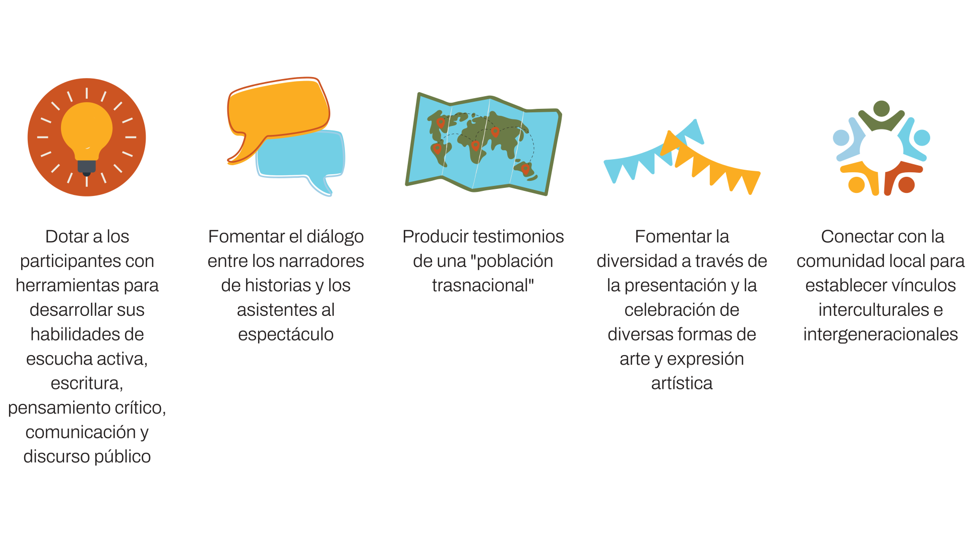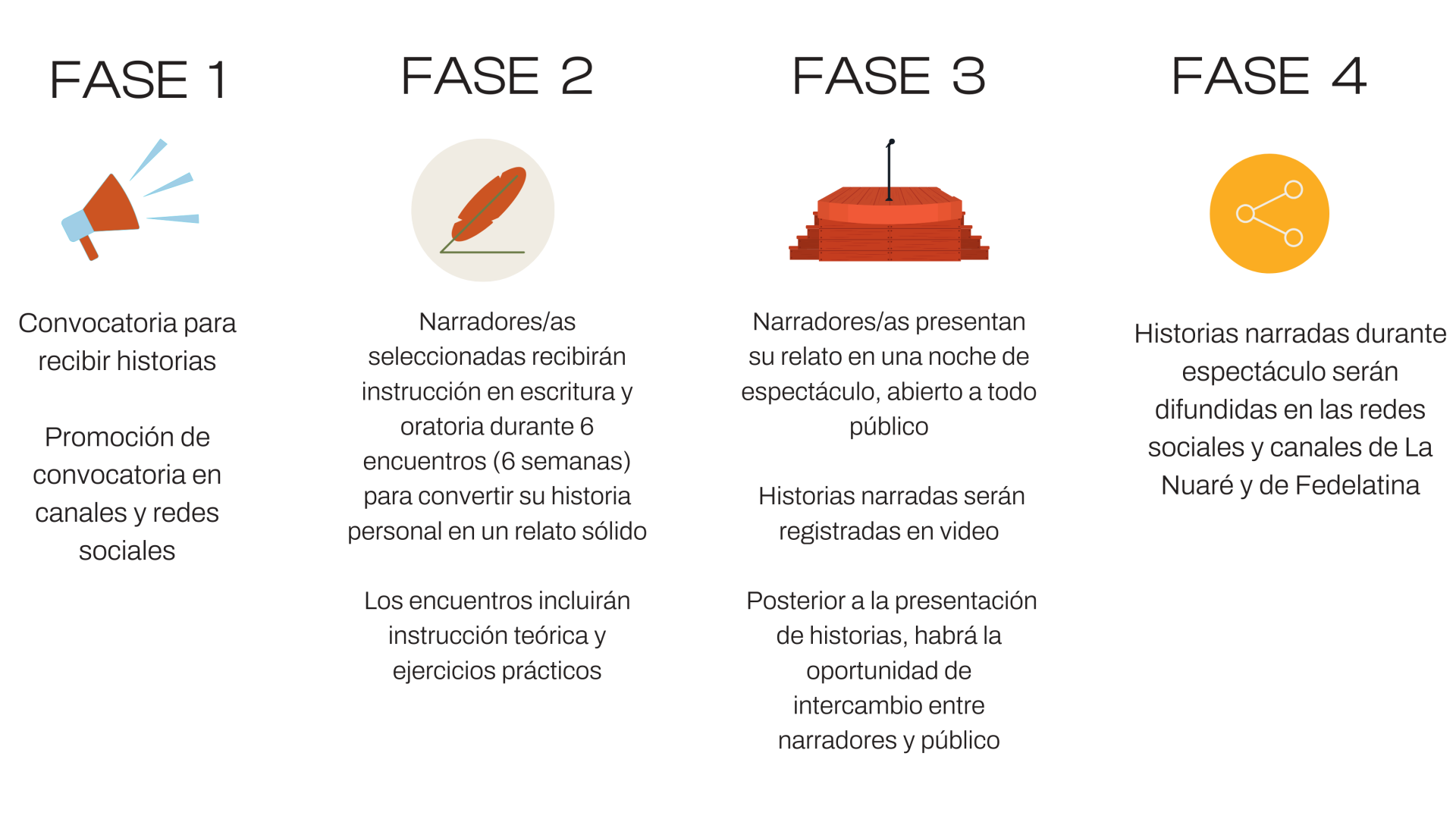 Nuestro ciclo de 6 encuentros está diseñado para ayudar a los participantes a desarrollar sus habilidades narrativas, de oratoria y de autoconocimiento y reflexión.